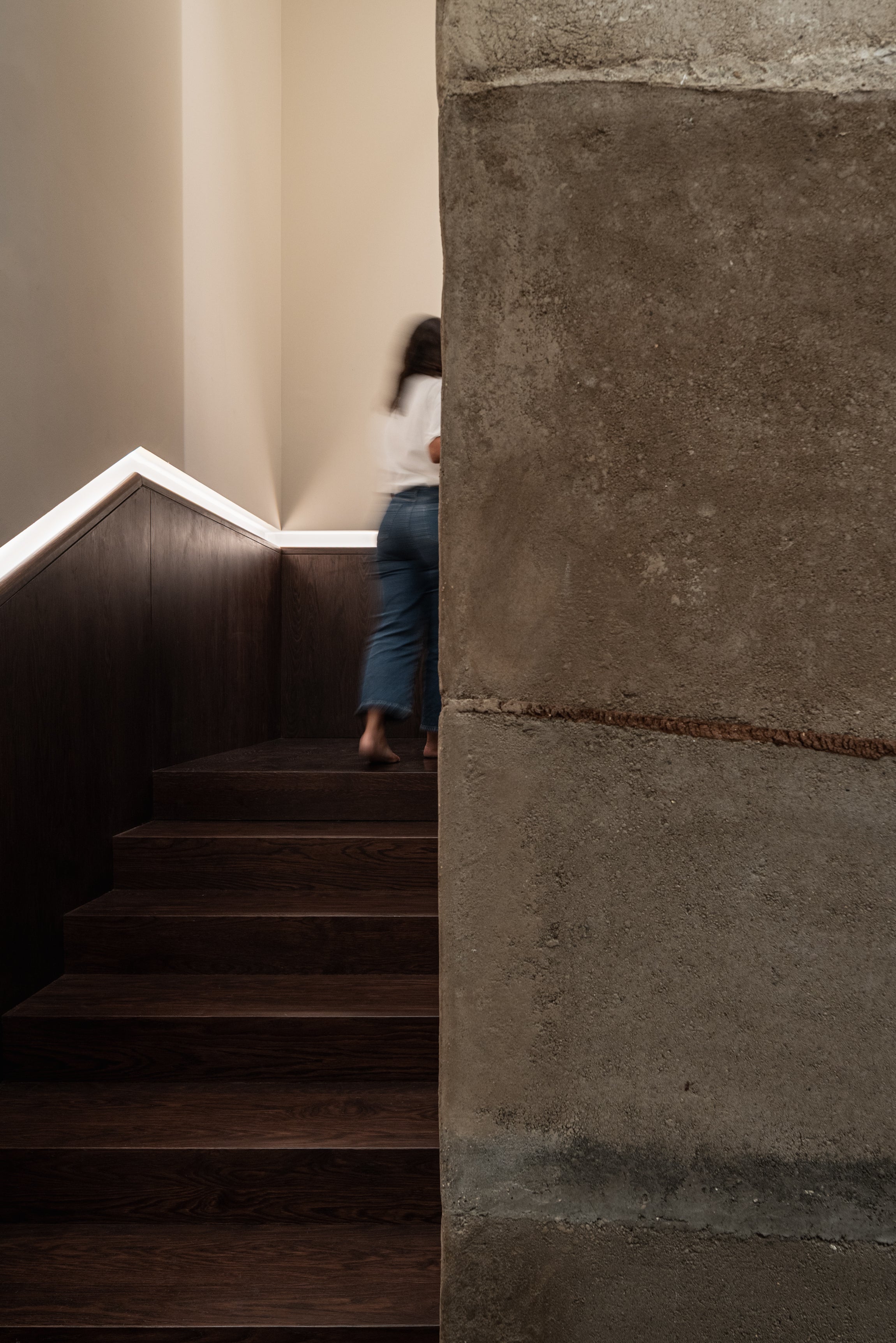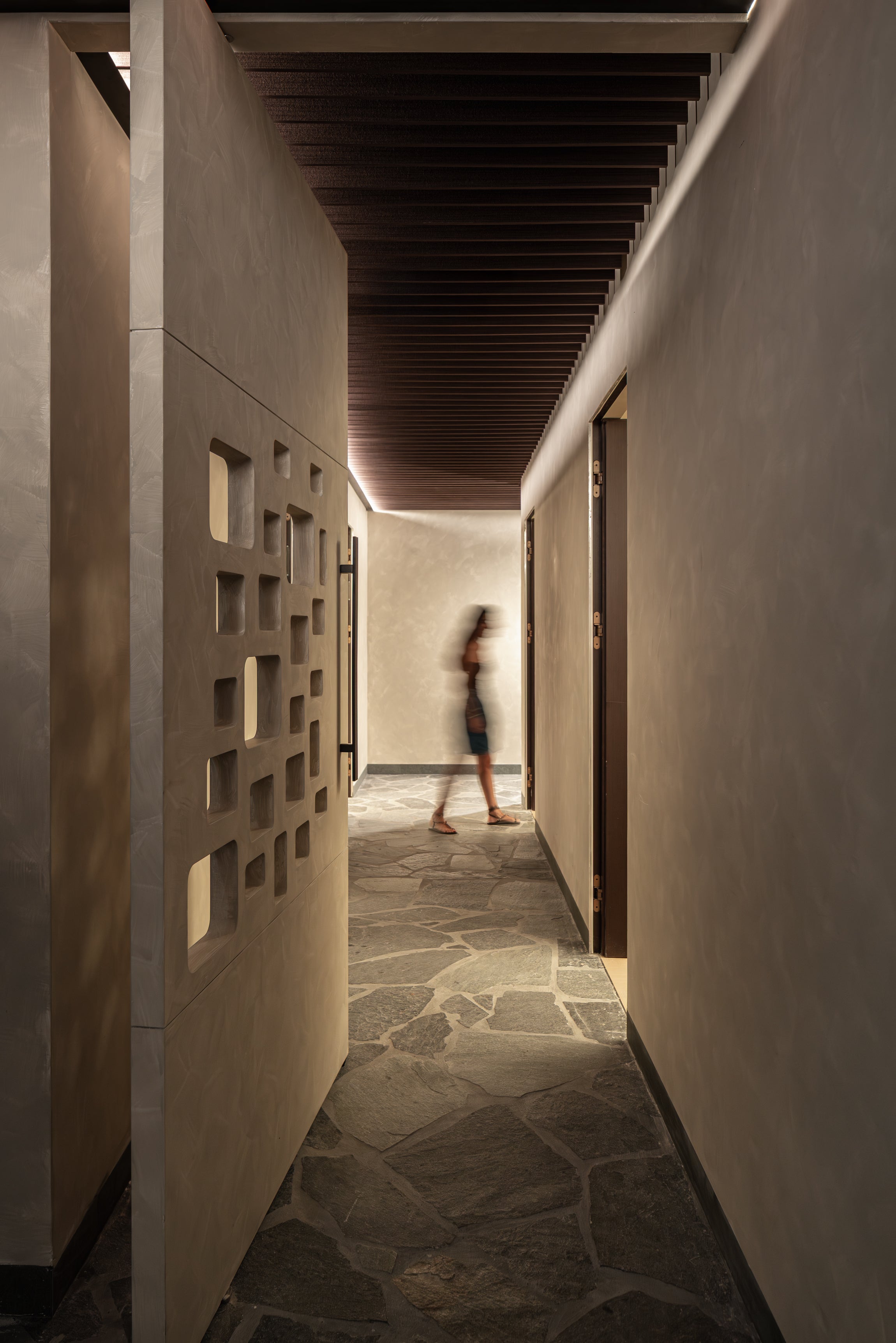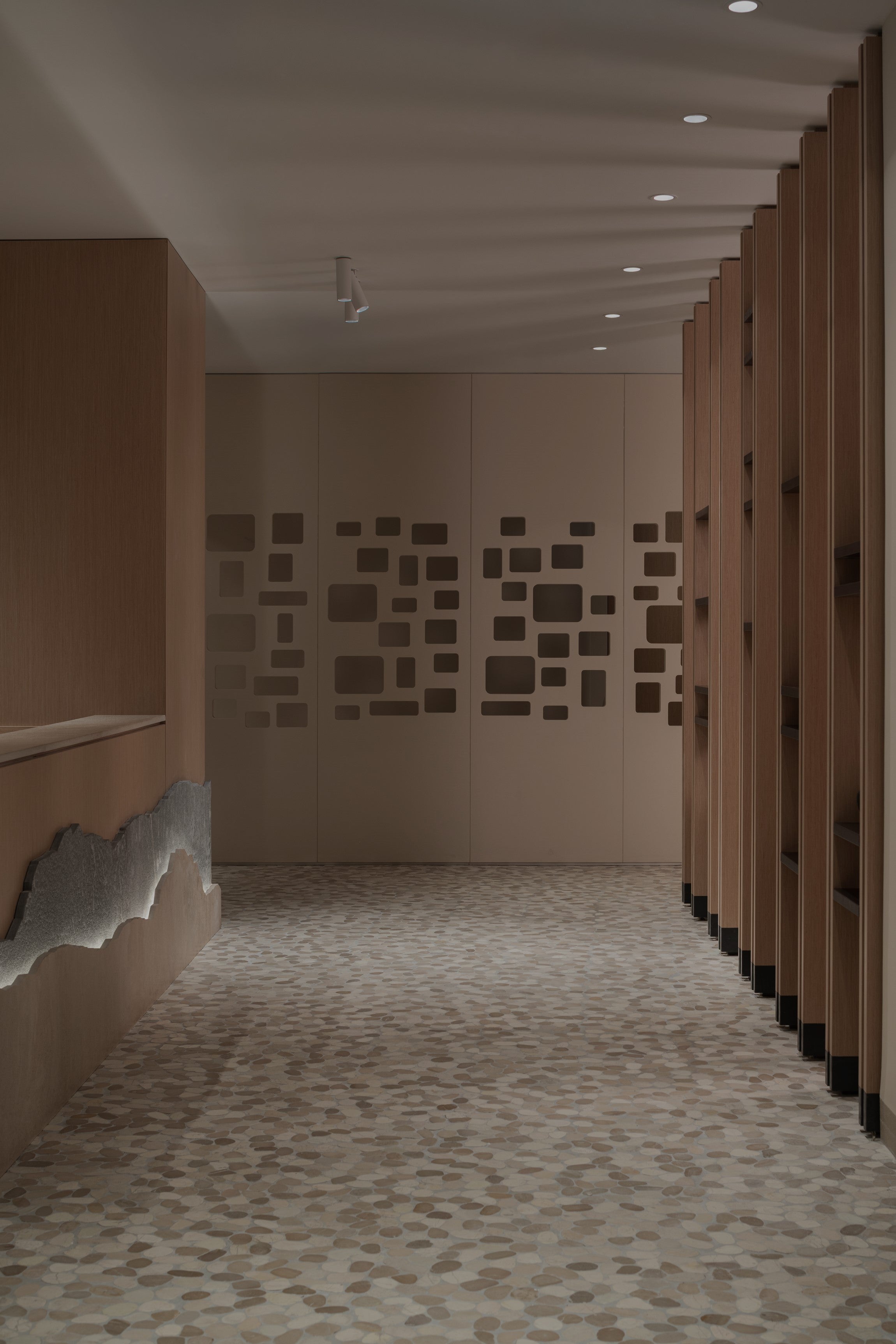 The entrance is filled with soft, bright tones that set a calm, welcoming atmosphere. As visitors descend, the environment gradually darkens, colors deepen, and lighting softens, guiding them into quiet reflection. This transition mirrors the moon’s journey from its bright to hidden side, revealing the beauty of contrast and shaping a space that feels grounded yet dreamlike.