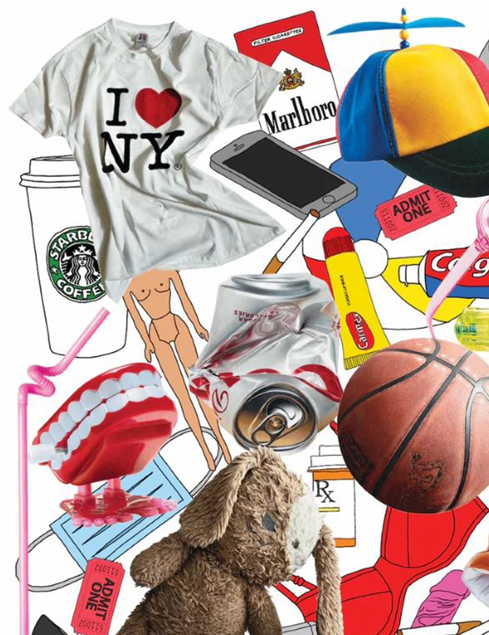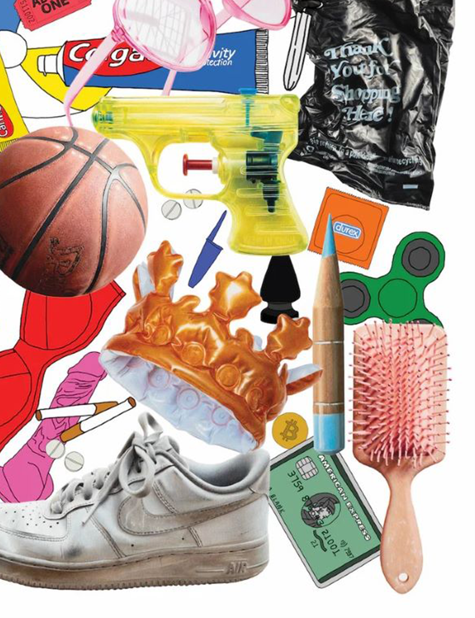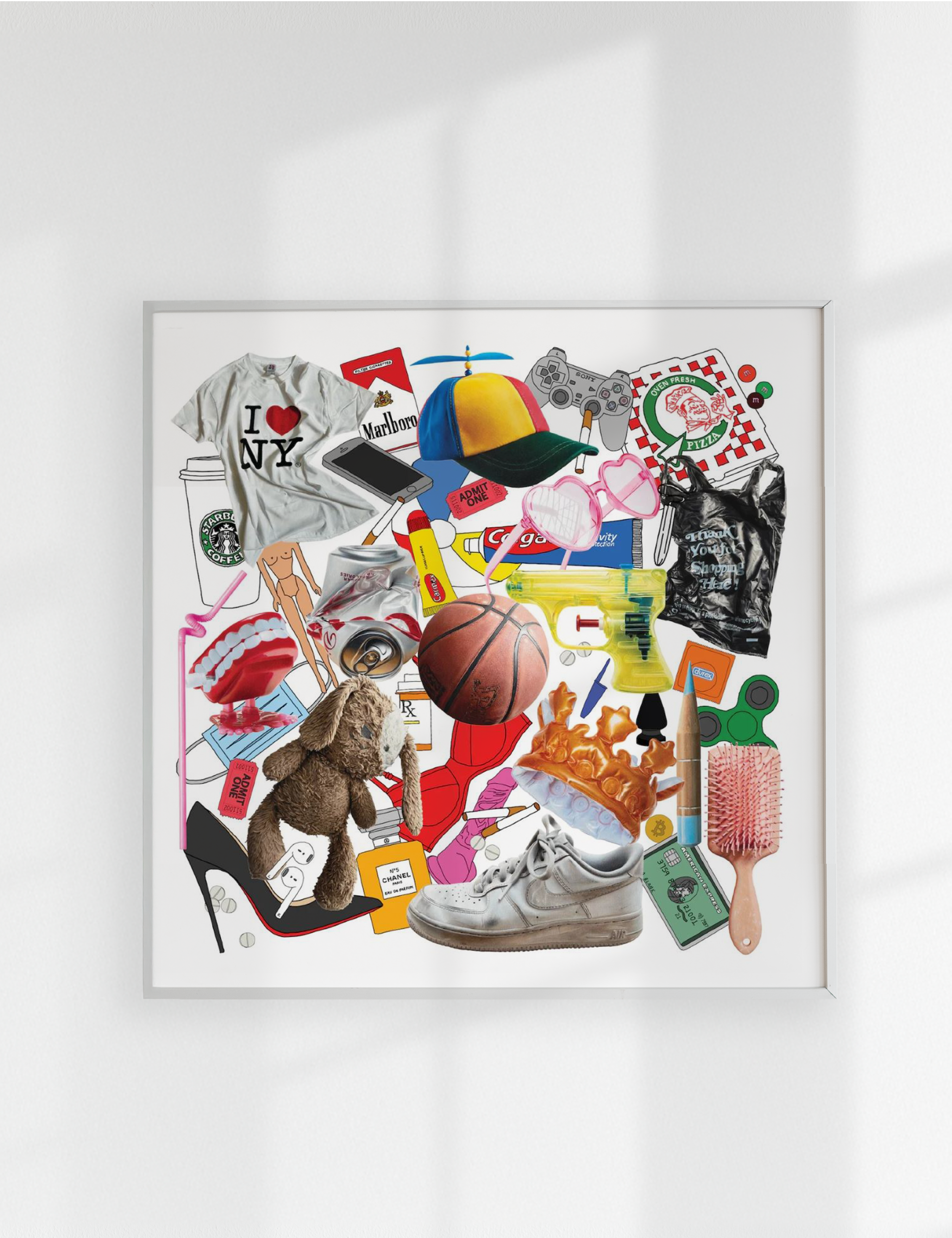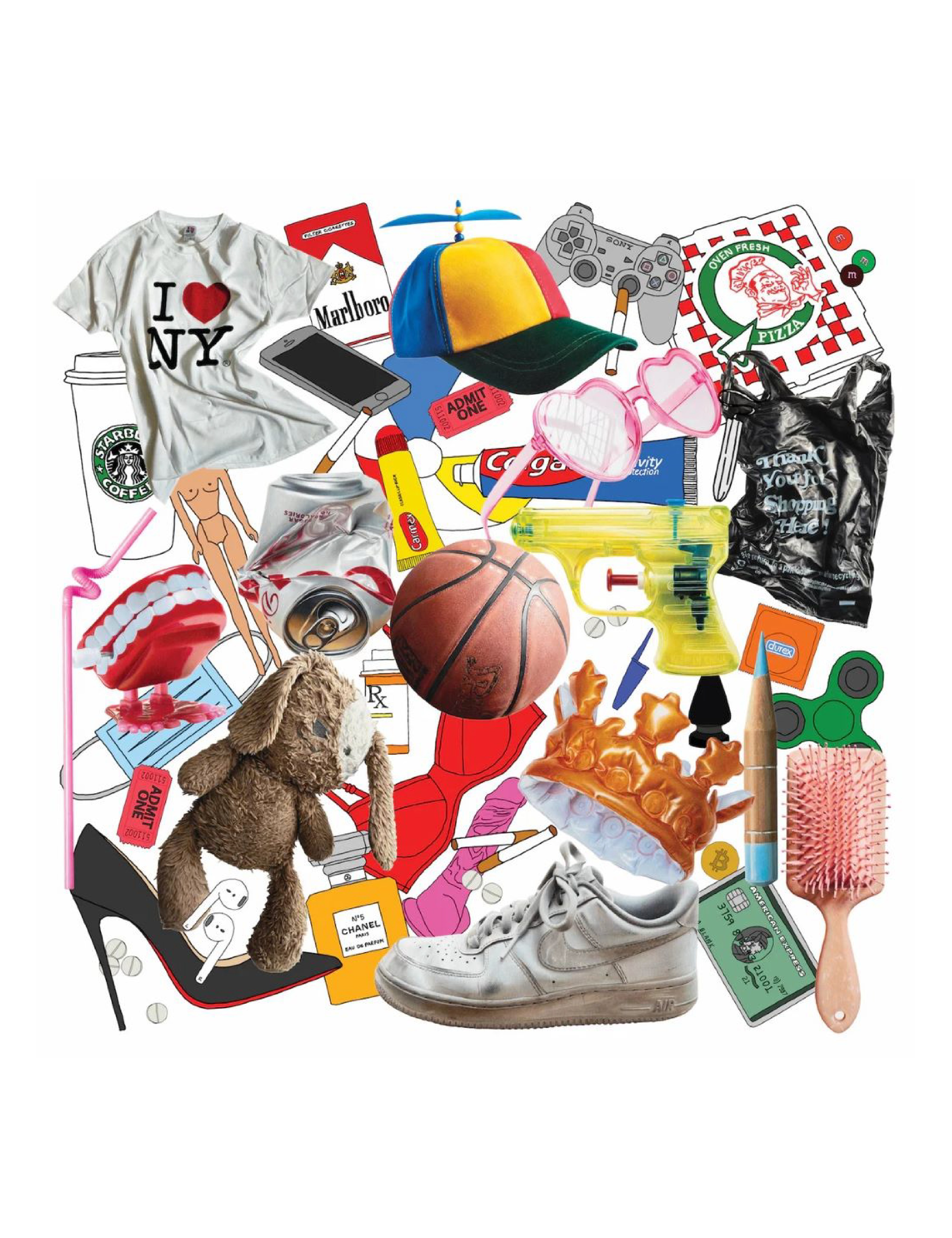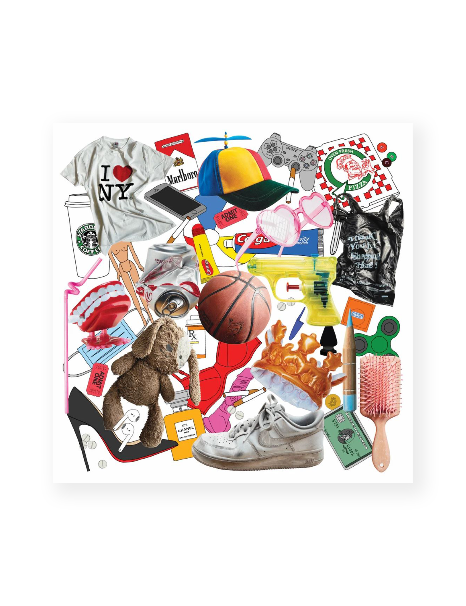 This piece, along with "Kitchen Sink Volume 1," features a vibrant collage of New York-themed everyday objects, luxury accessories, streetwear items, popular snacks, and a pair of worn Nike Air Force 1 sneakers.