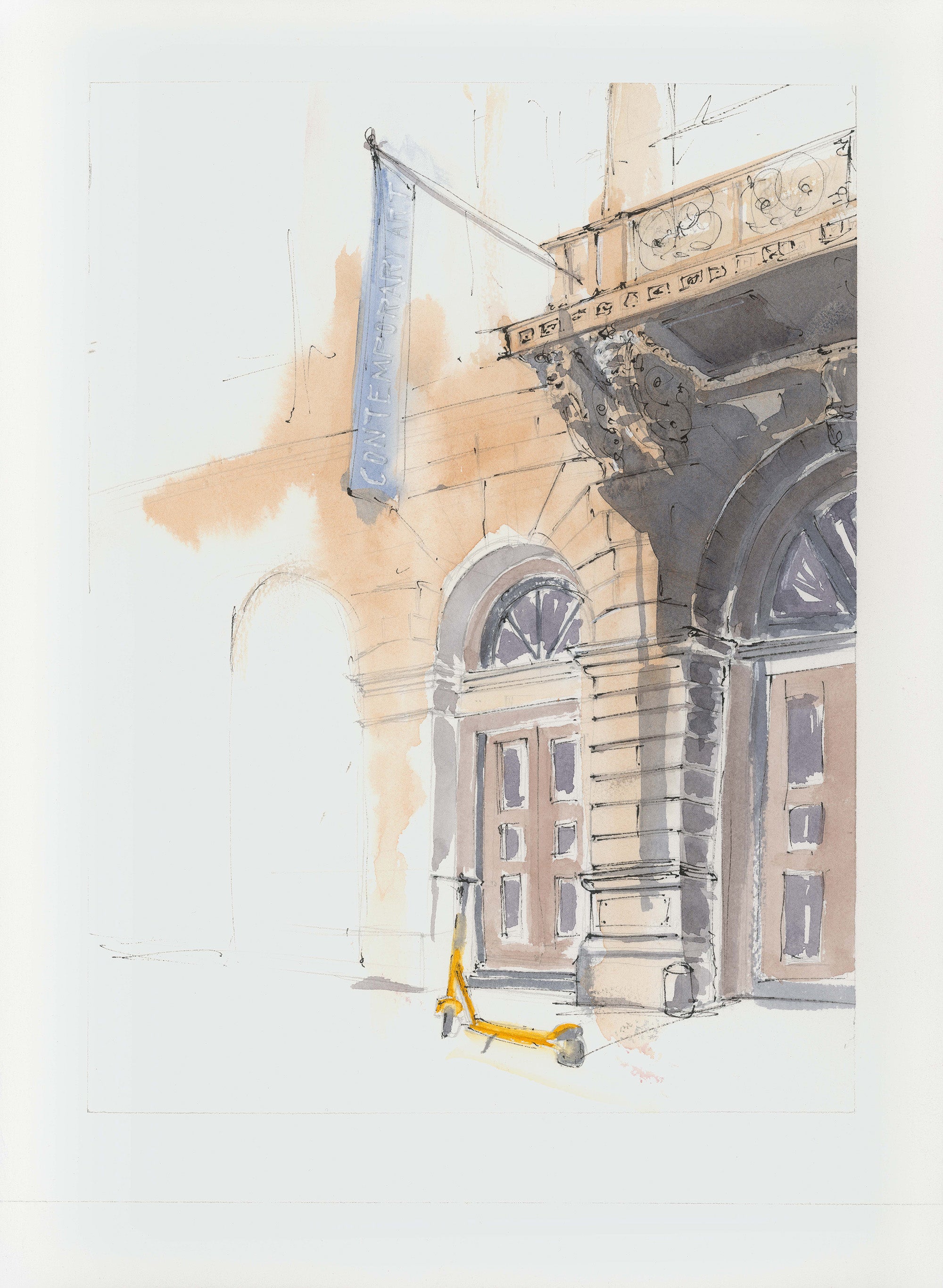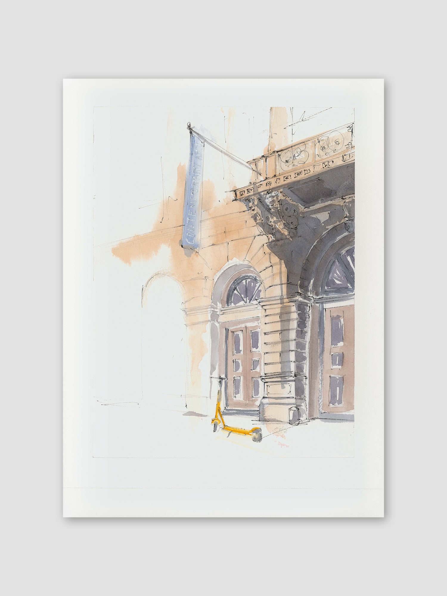 A refined exploration of architectural elegance, this watercolor print beautifully portrays the intricate details of a historic Vienna facade. With fluid brushstrokes and a delicate interplay of light and shadow, the piece captures the timeless charm of the city's architectural heritage, inviting a moment of quiet appreciation for urban beauty.